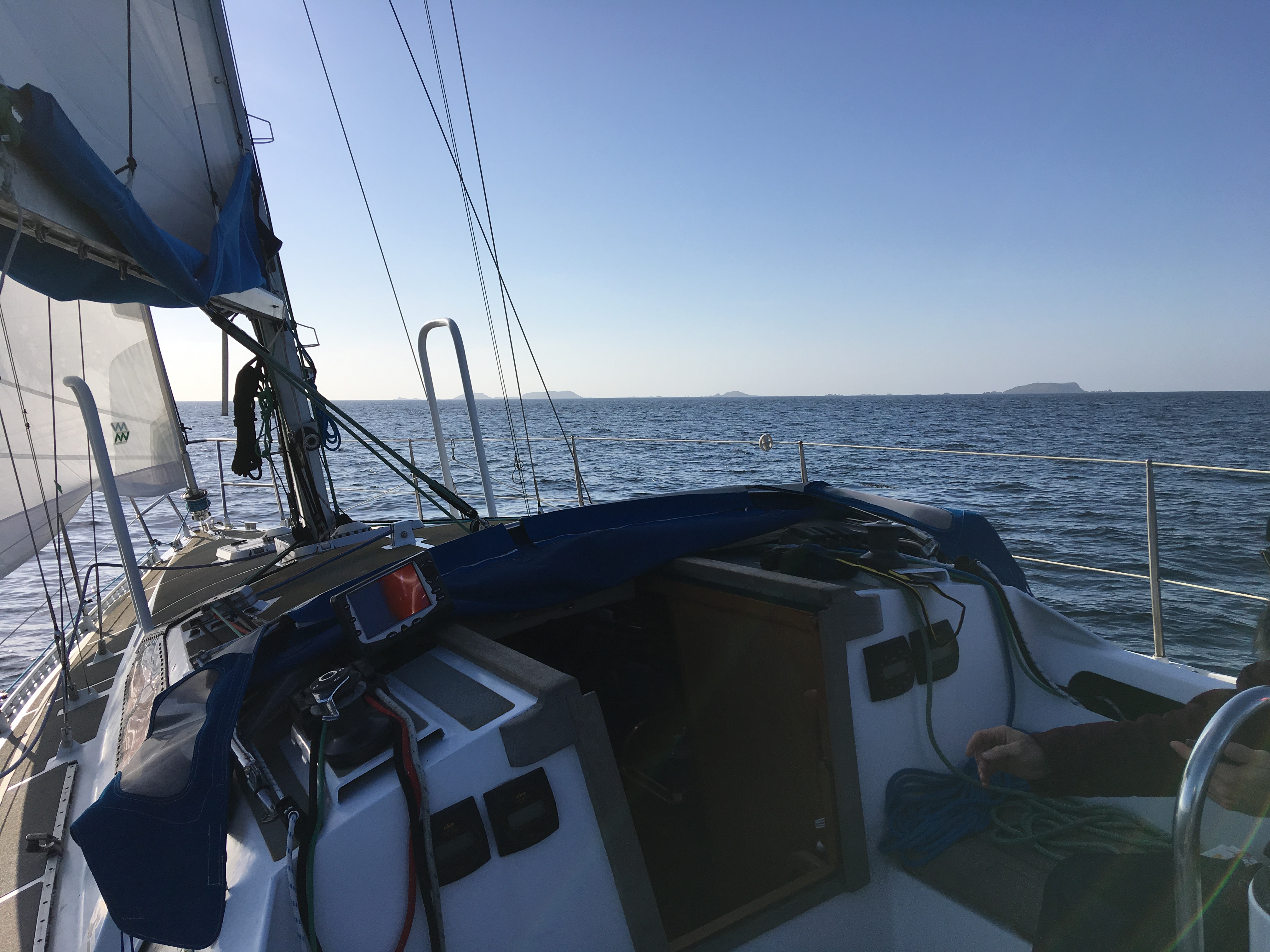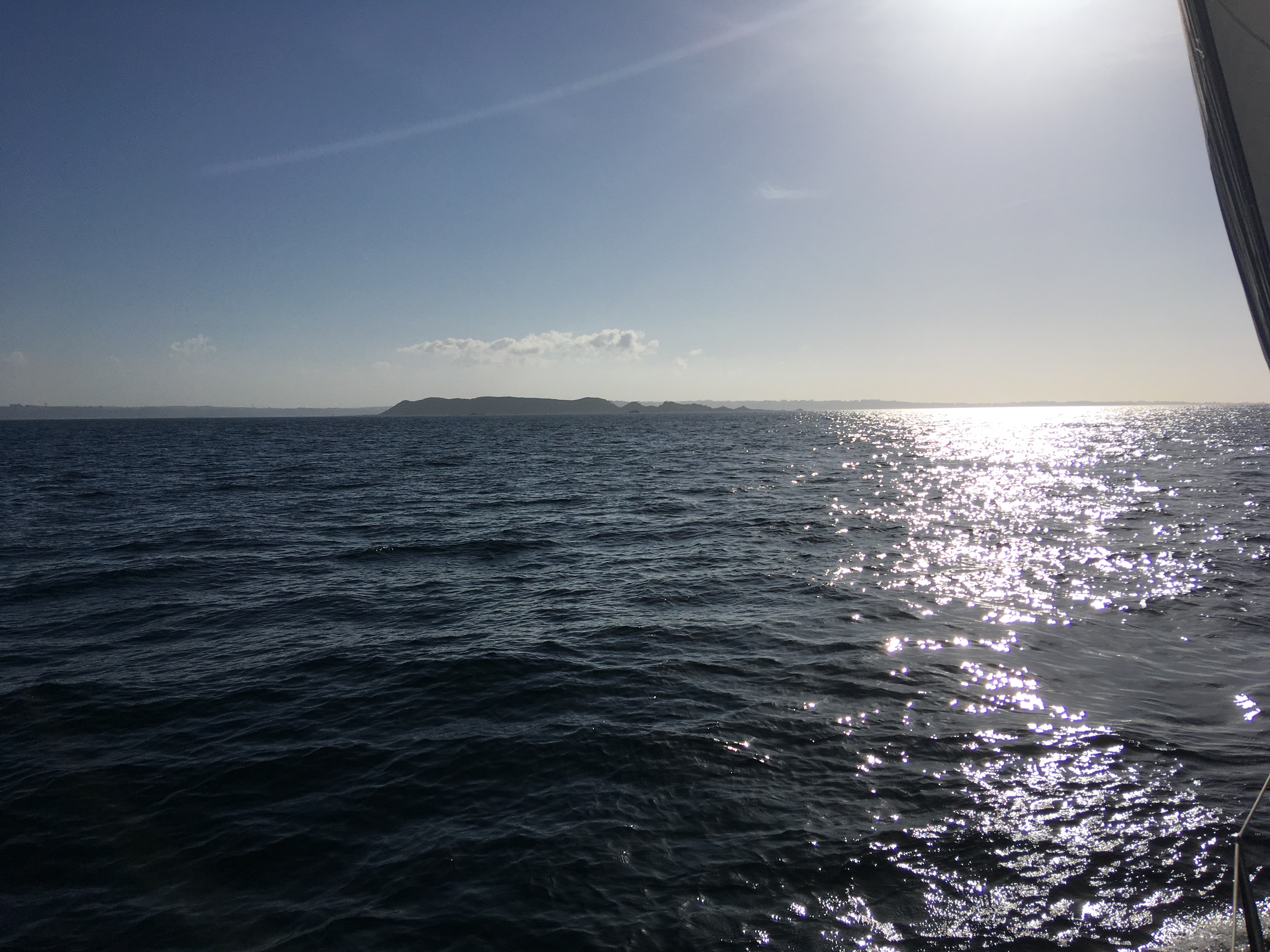 Puis départ à 15h30 pour Lorient via Les Glénans, dans une mer d’huile et la pétole : moteur !