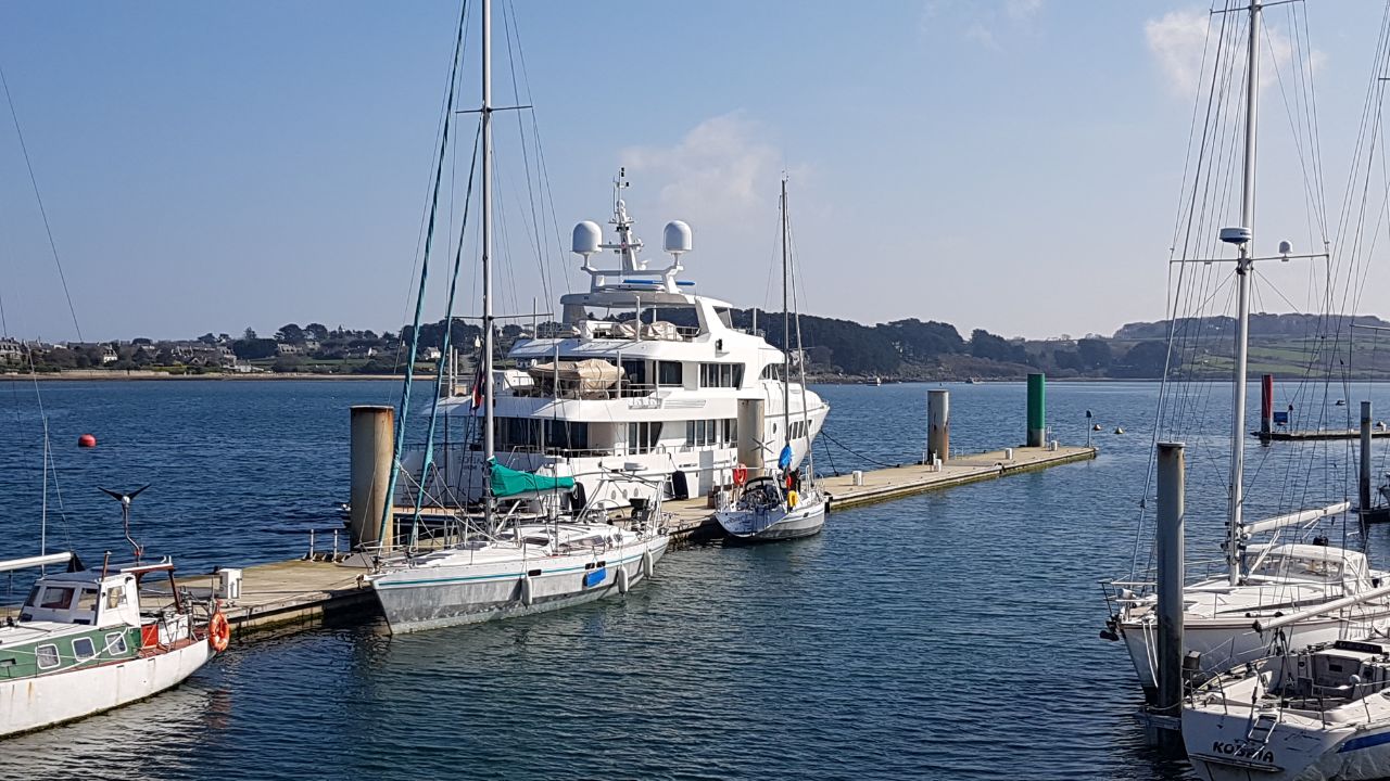 A 19 h au ponton visiteur, voisin d’un OVNI 495 et d’un gros yacht à moteur de richissime propriétaire.