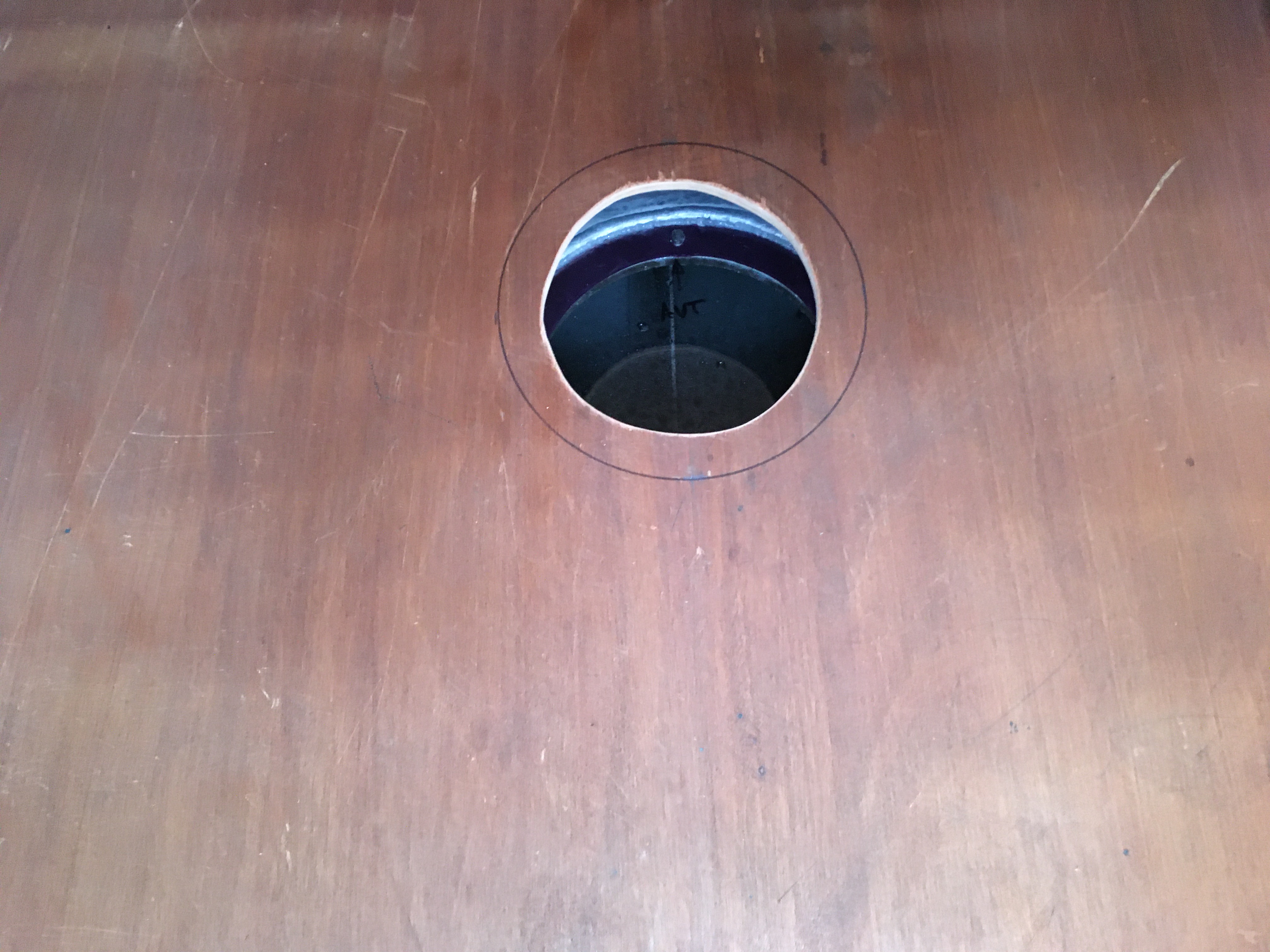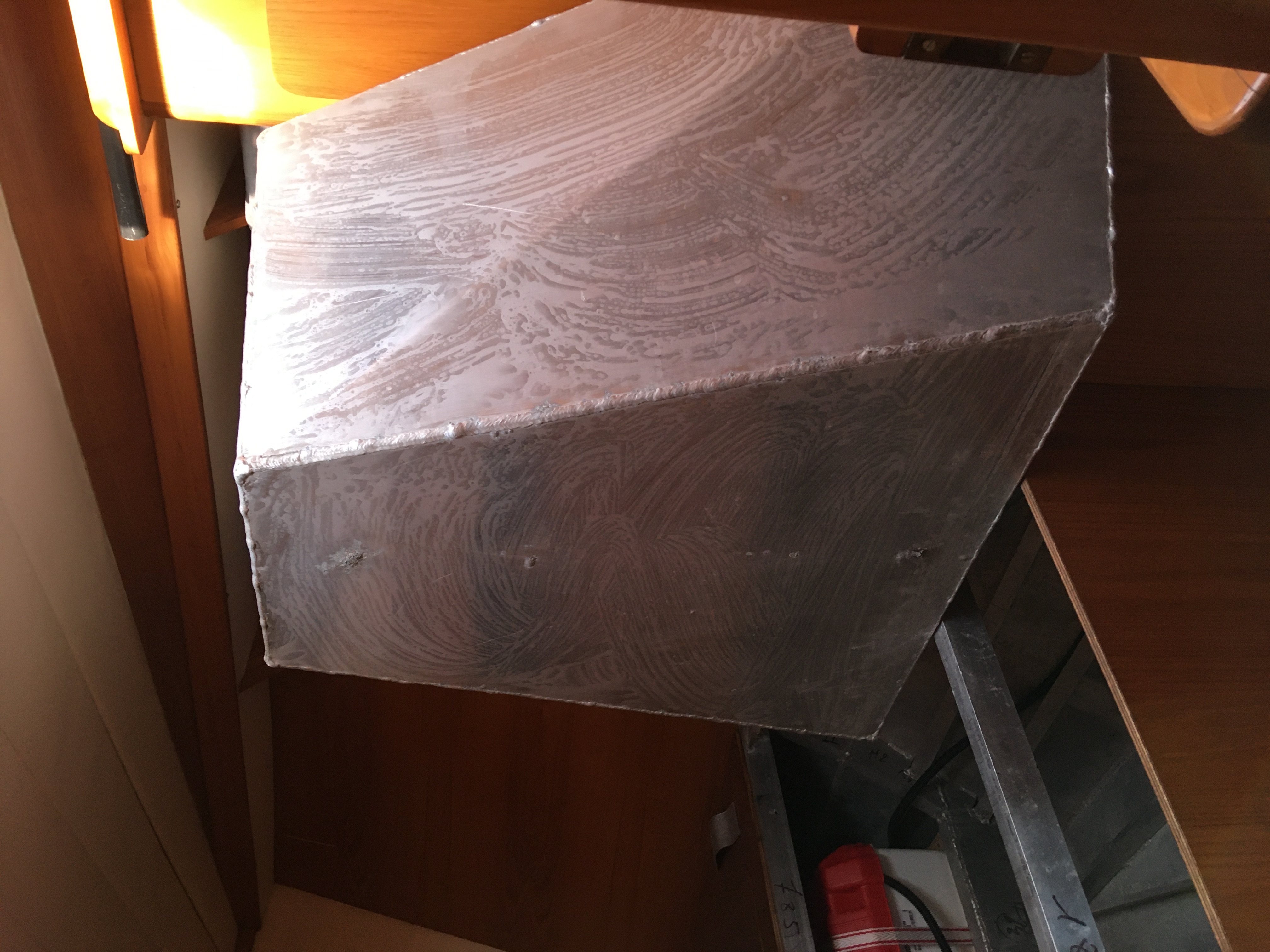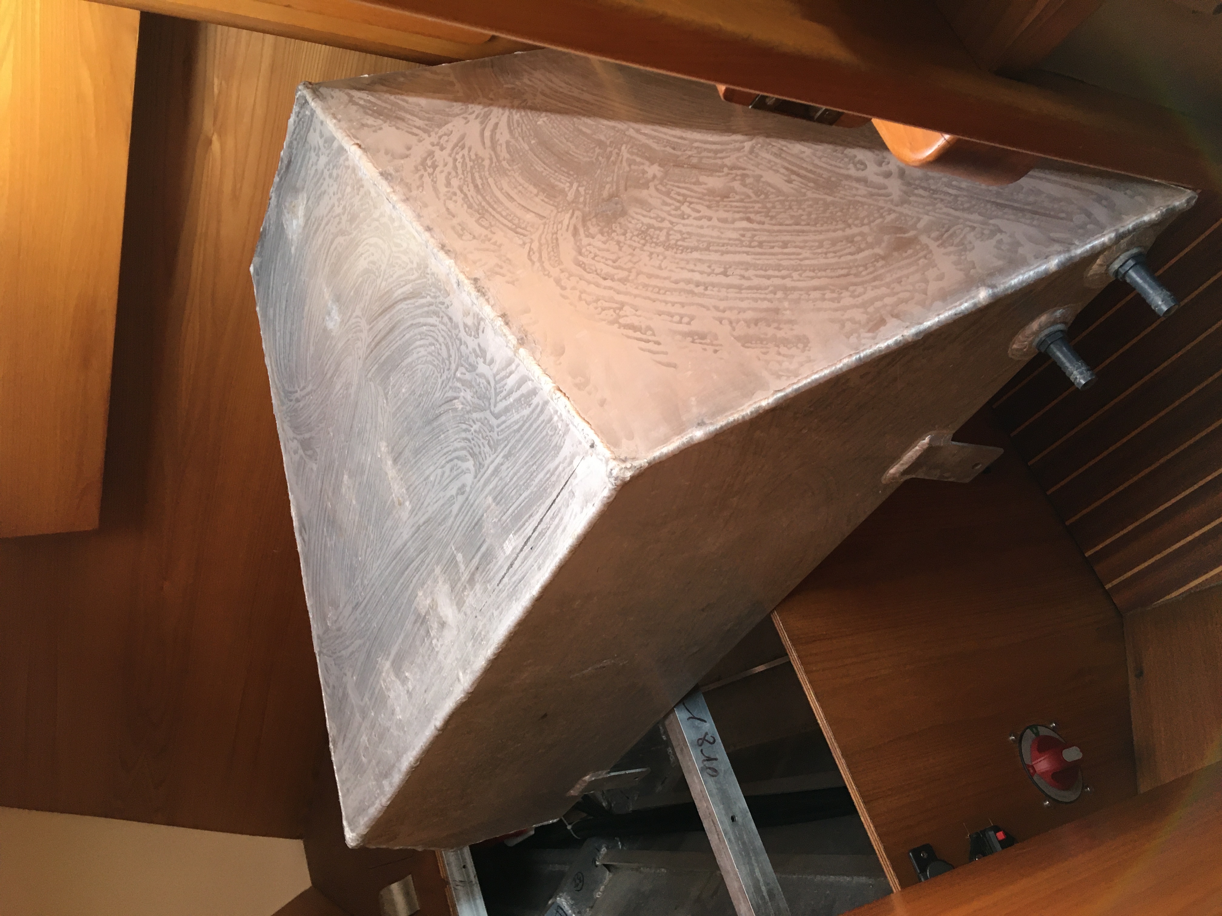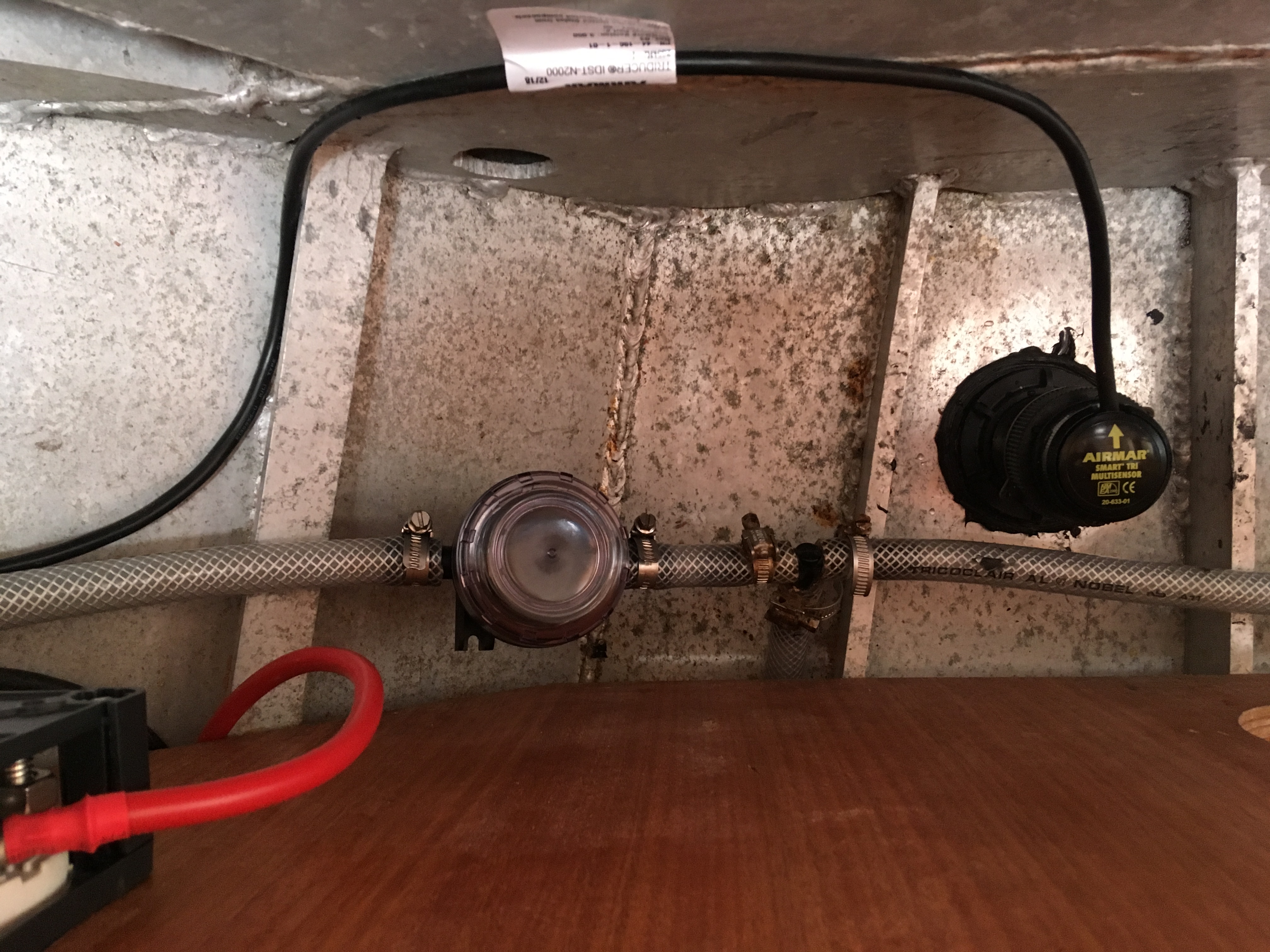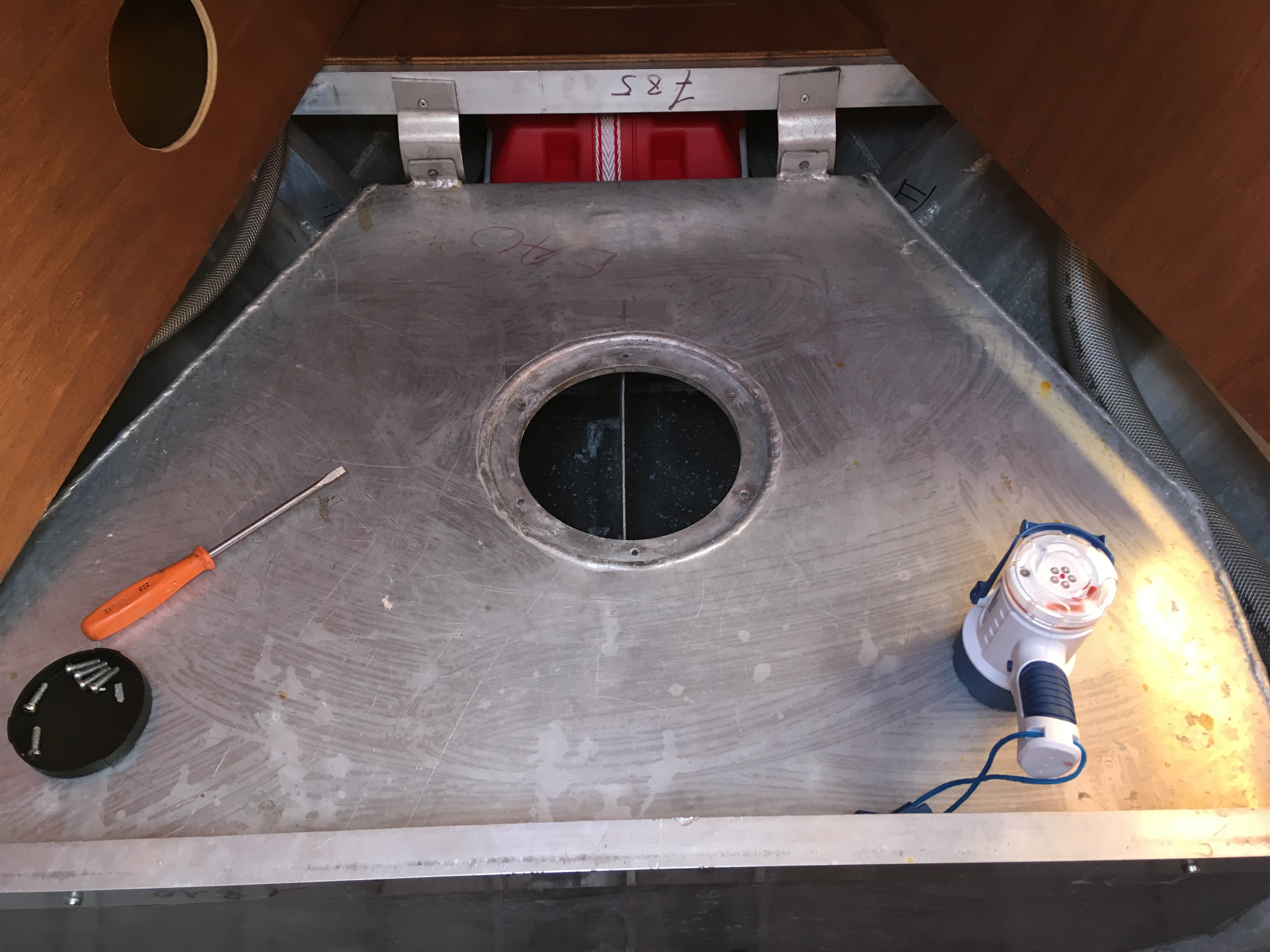 la mise en eau avant le convoyage de St Brieuc à Lorient s'est fait un peu à l'aveugle car le tank est fermé par une trappe en alu de 25 cm de diamètre, vissée et jointoyée au silicone, et il n'existe pas de jauge.
