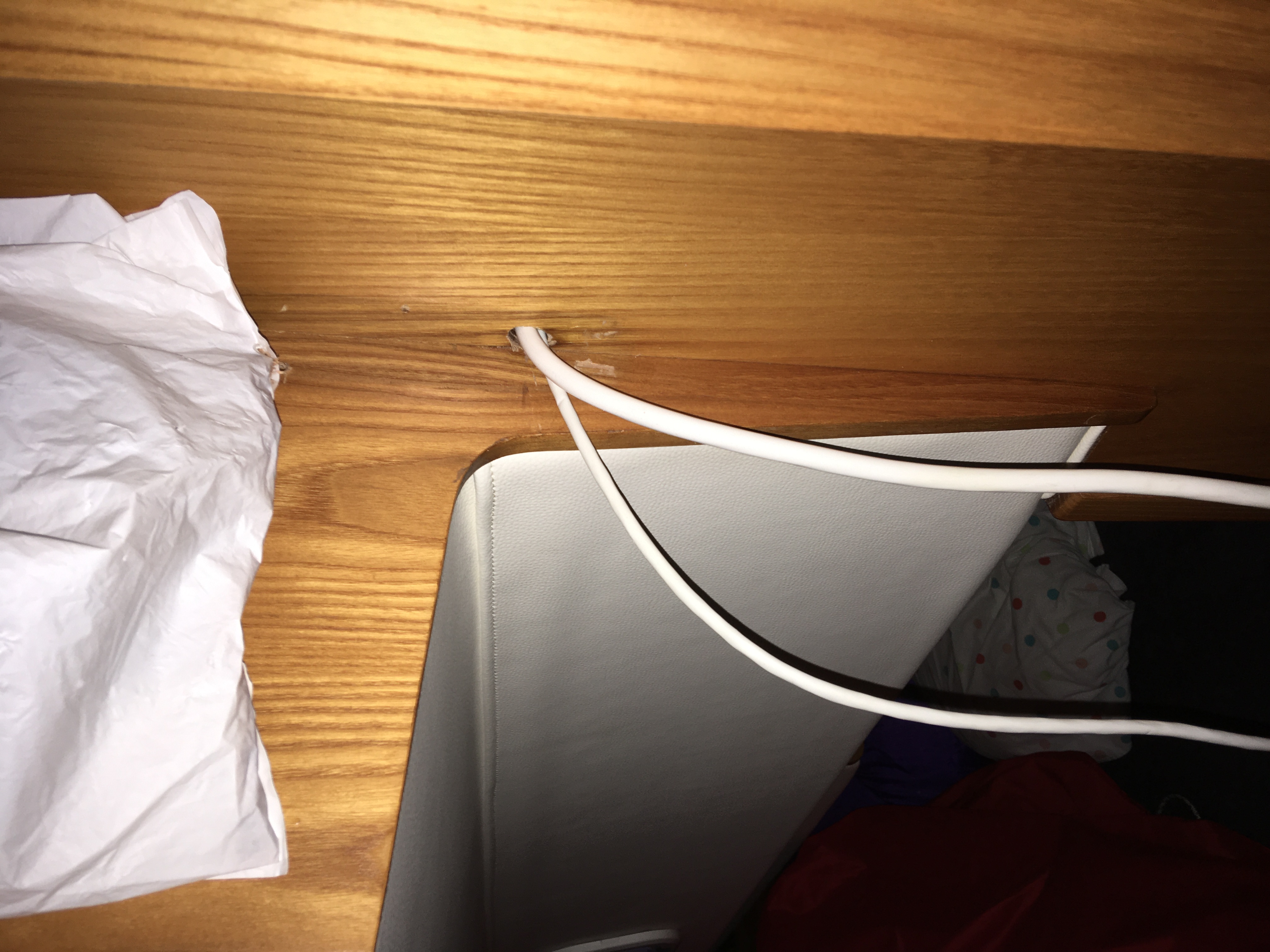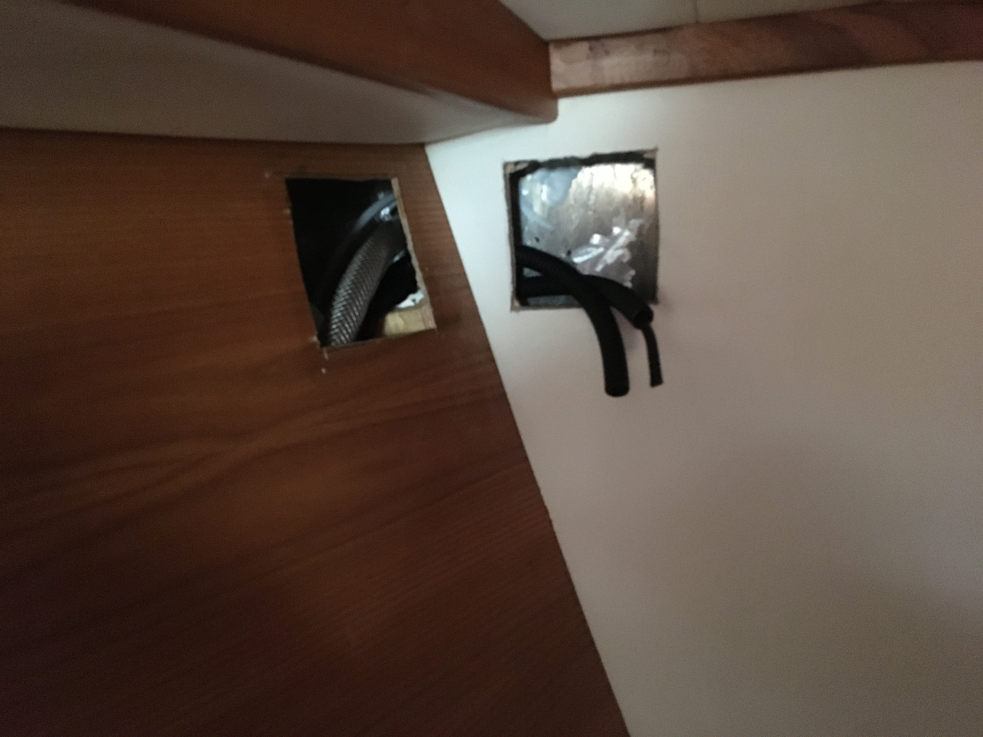 Passage des câbles depuis l'avant vers la cabine arrière à travers des gaines tirées dans les coffres tribord.