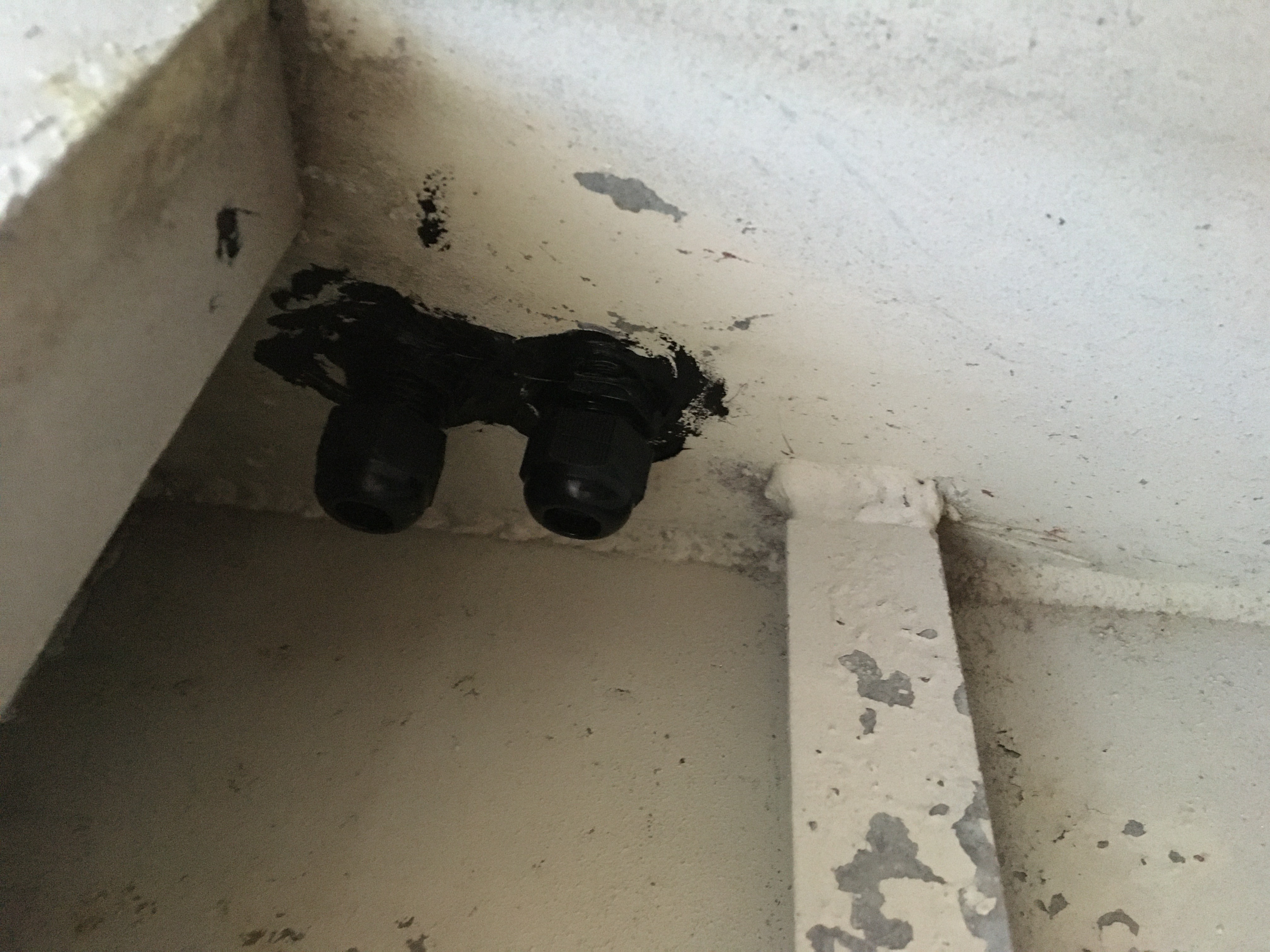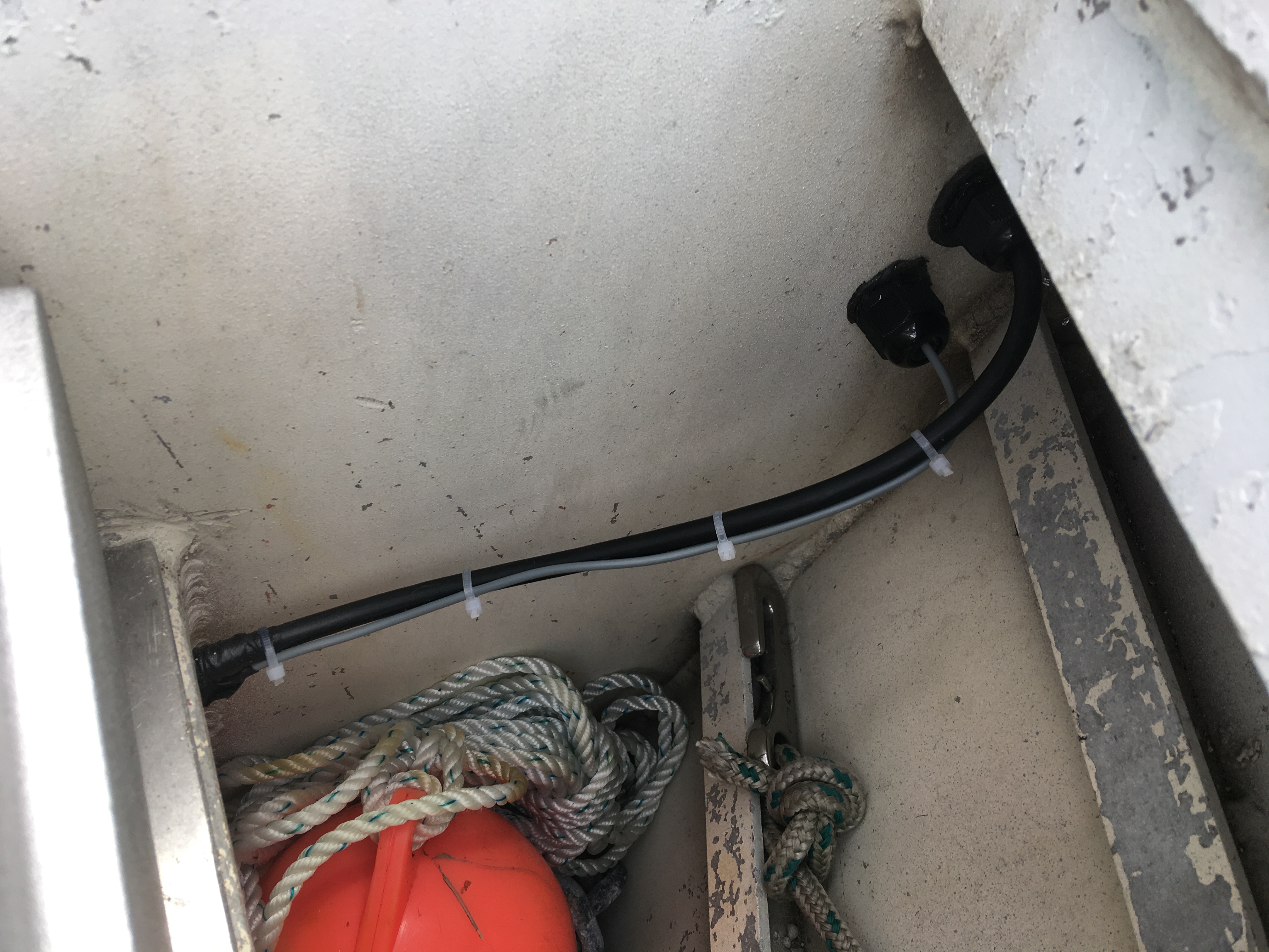 Installation des passes-coque : deux de chaque cotés. Négatif et câble réseau sur bâbord, les deux positifs (montée / descente) sur tribord.