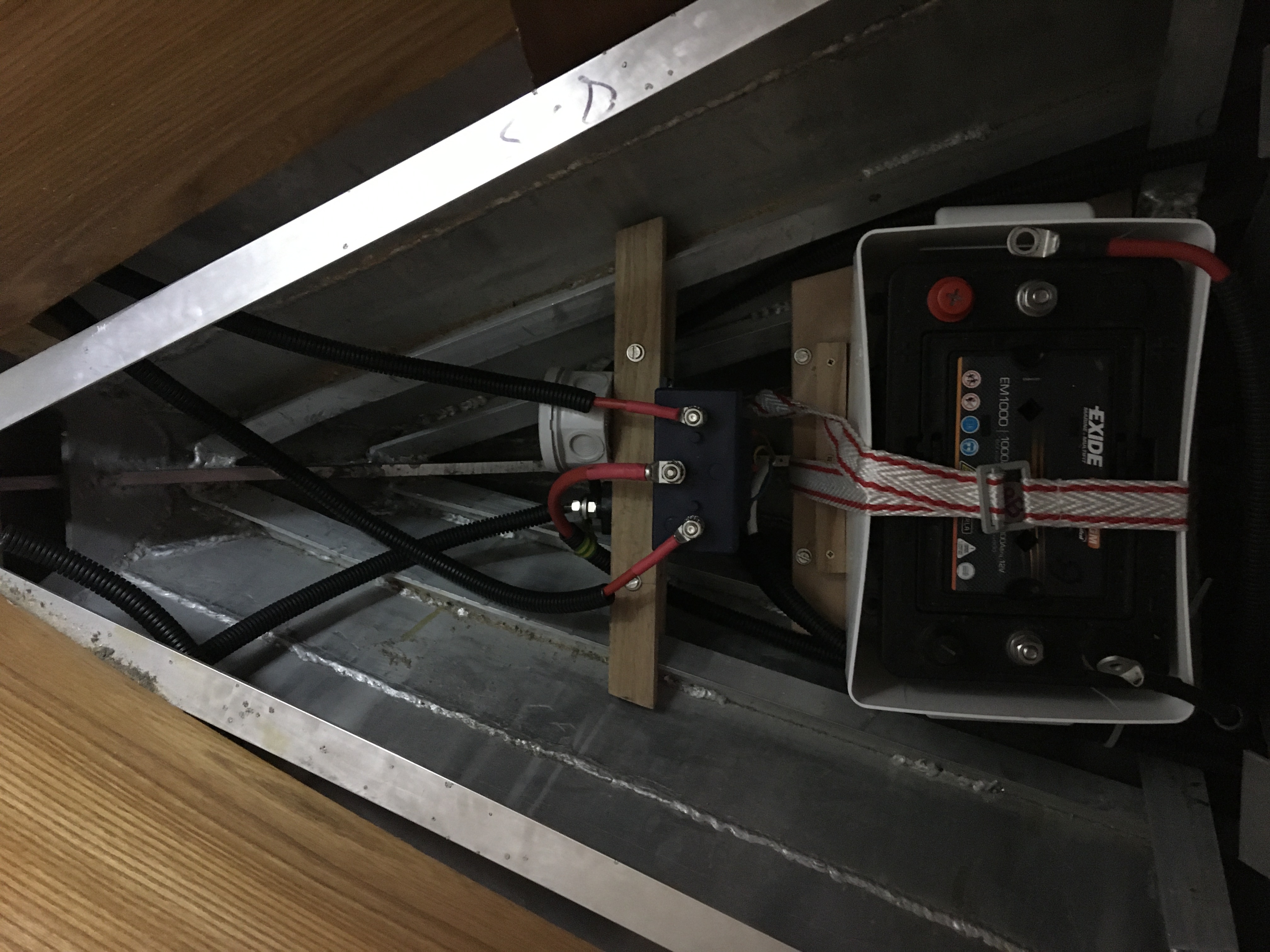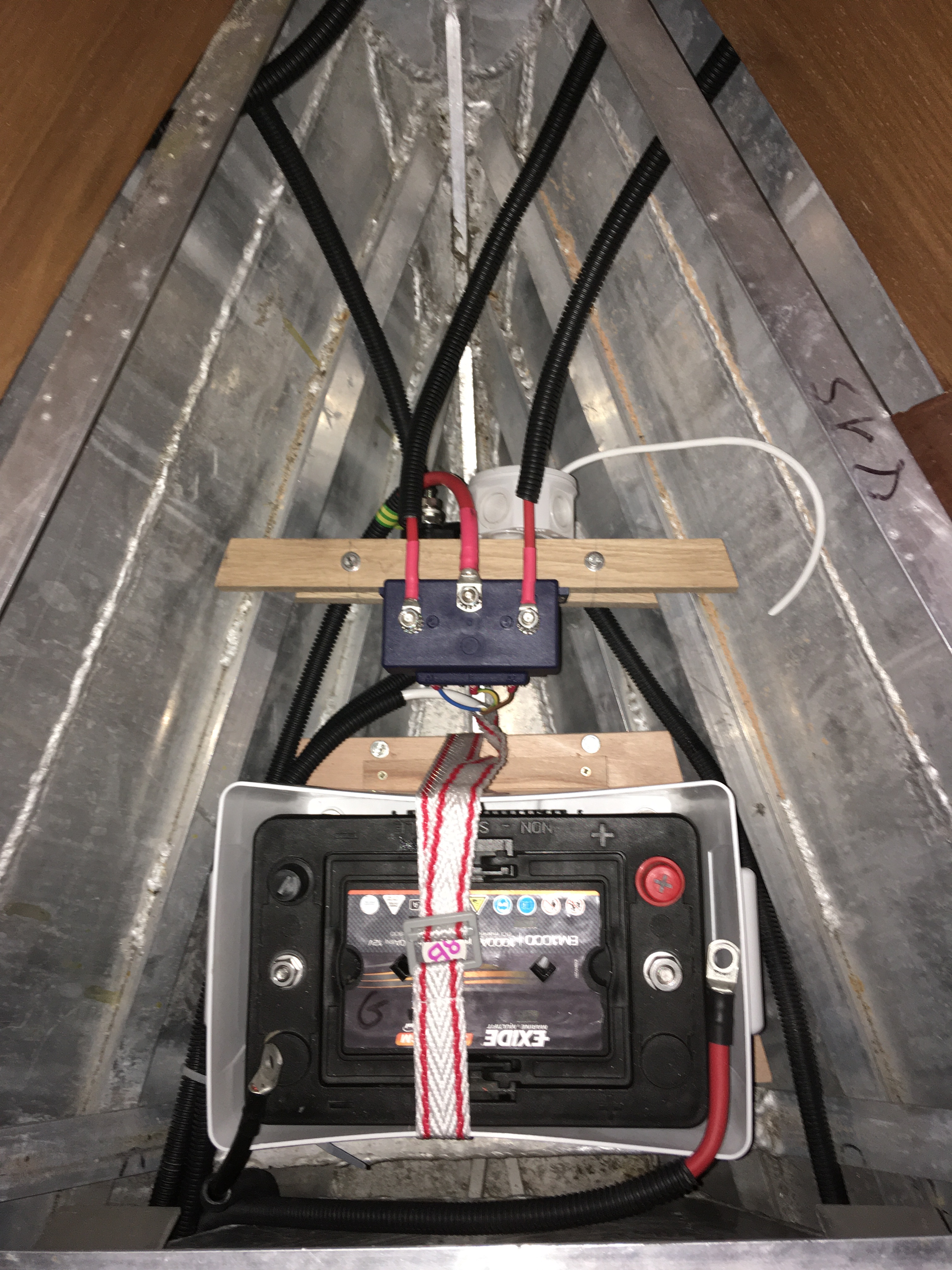 En avant de la batterie, j'ai installé le relais de commande du guindeau sur une traverse en bois solidement fixée sur les lisses.