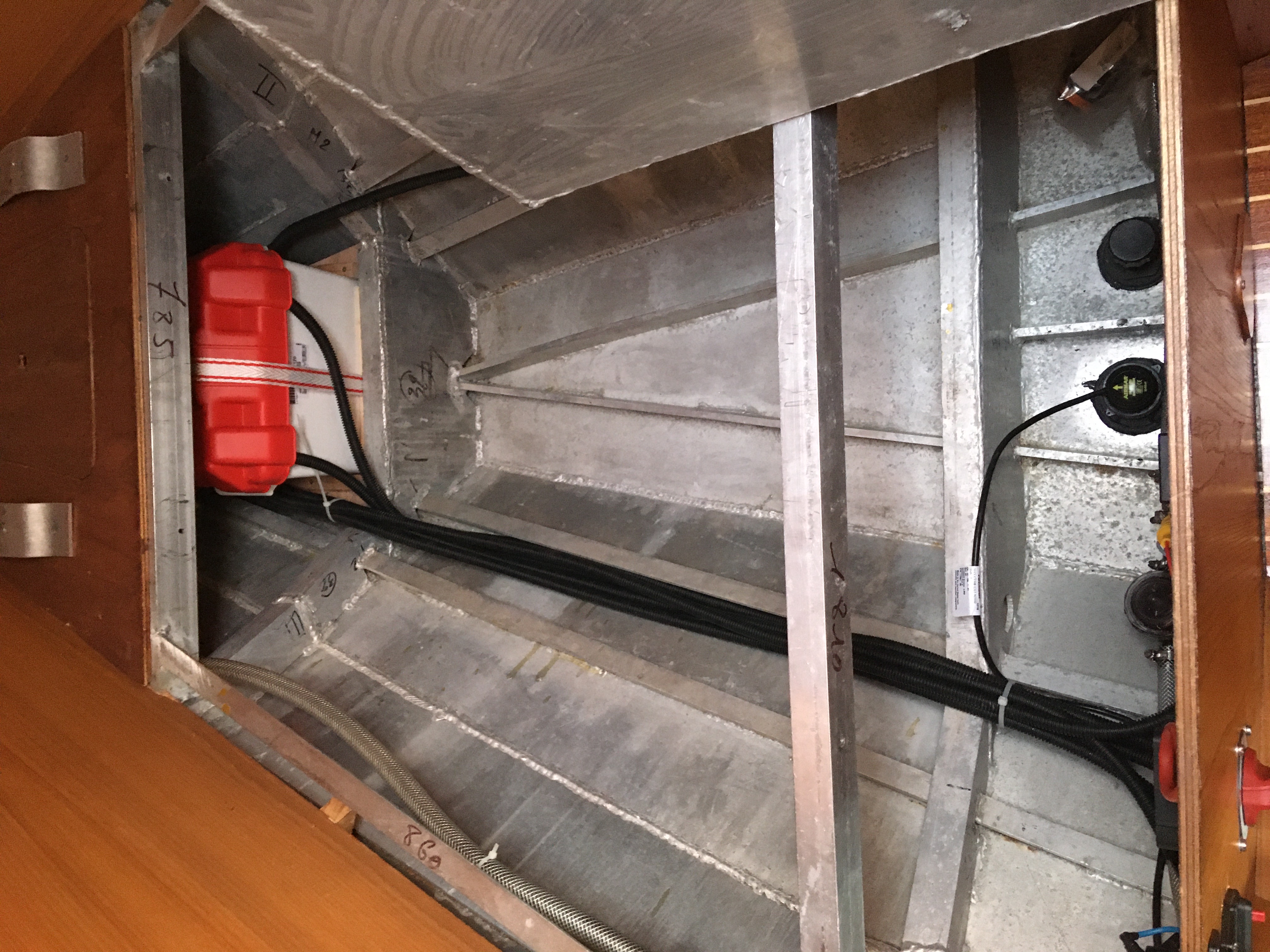 Le câblage court à travers des gaines sous le vaigrage pour passer à raz du pont dans la baille à mouillage par des passes-coque étanches.