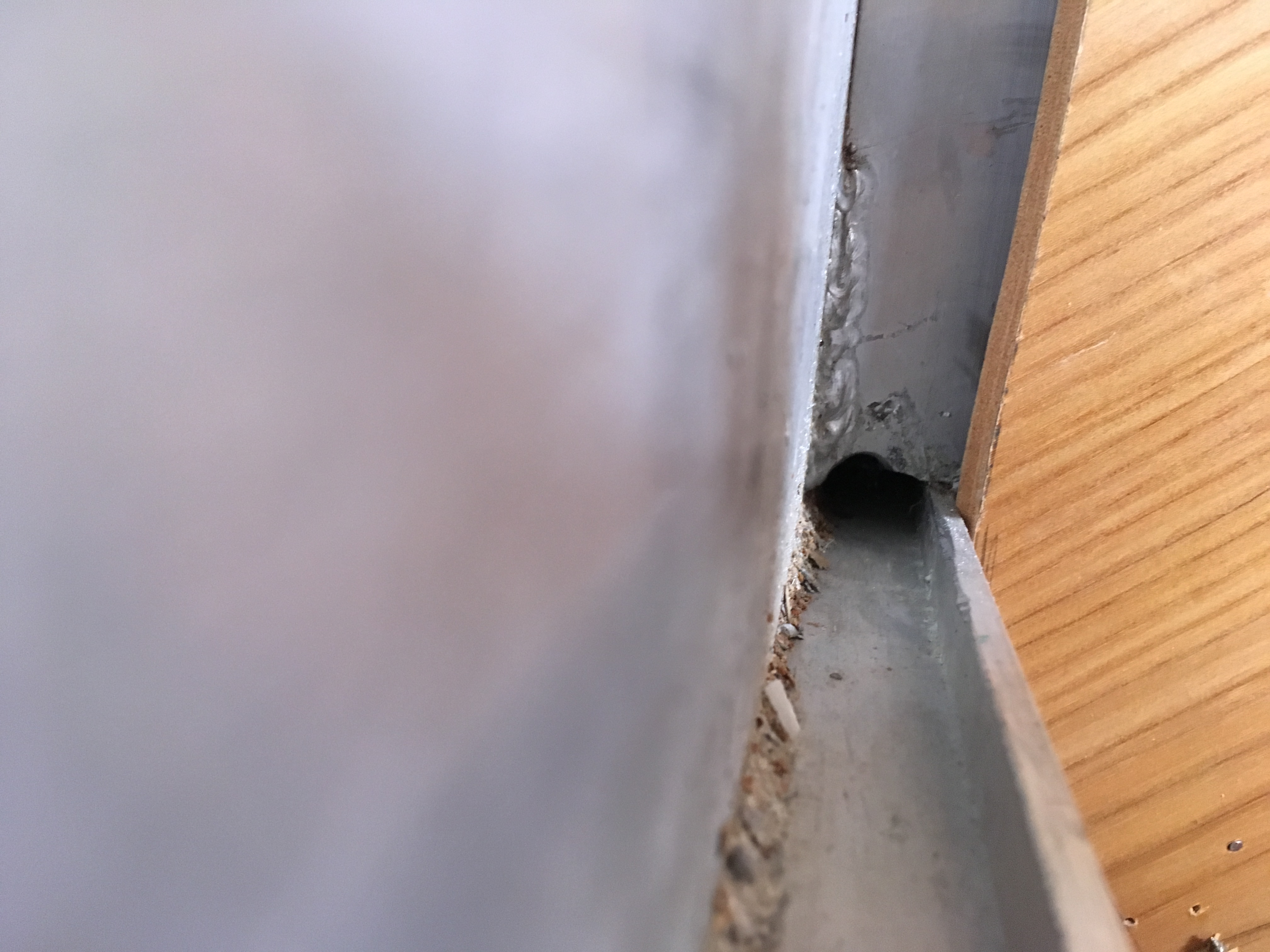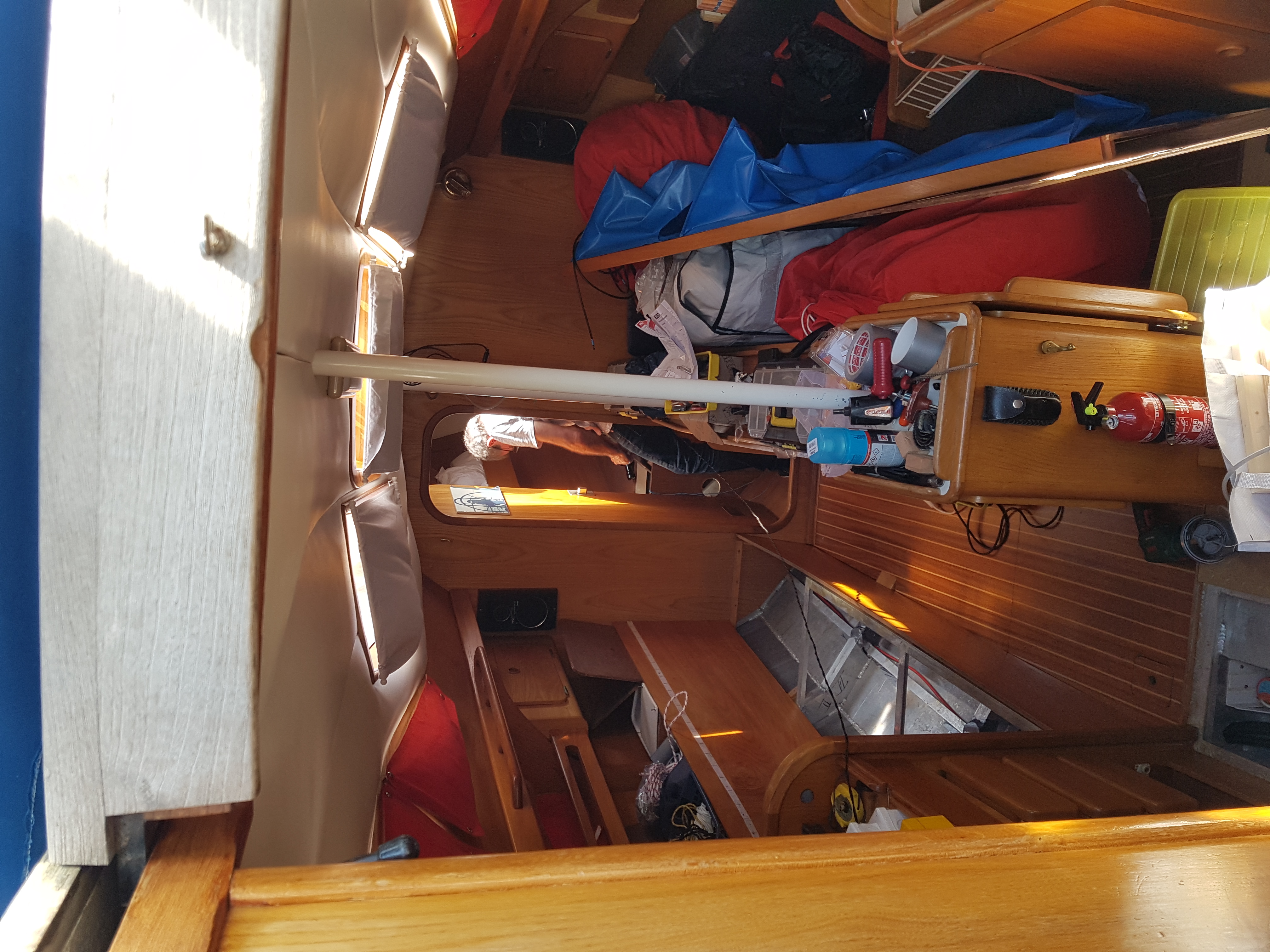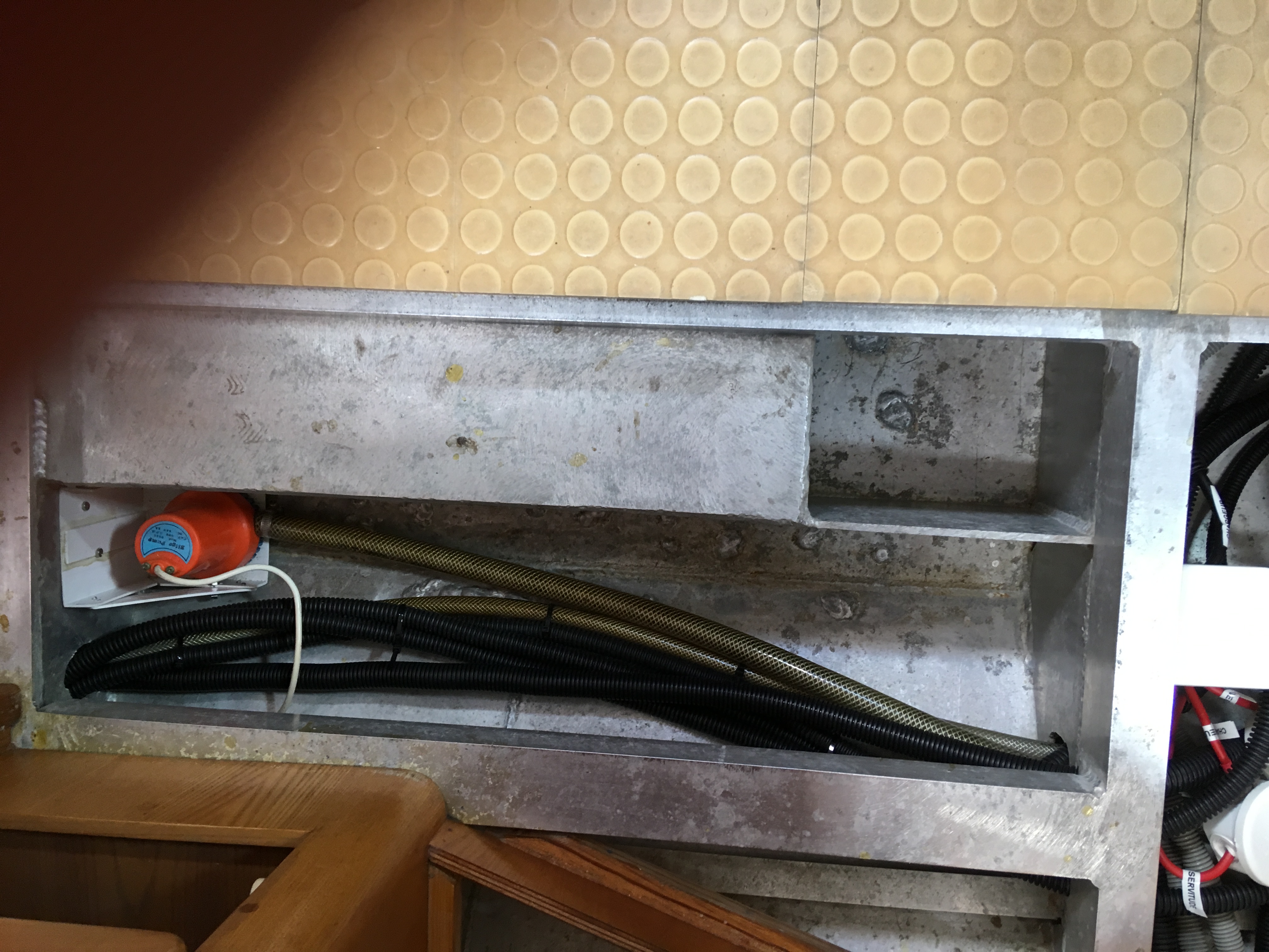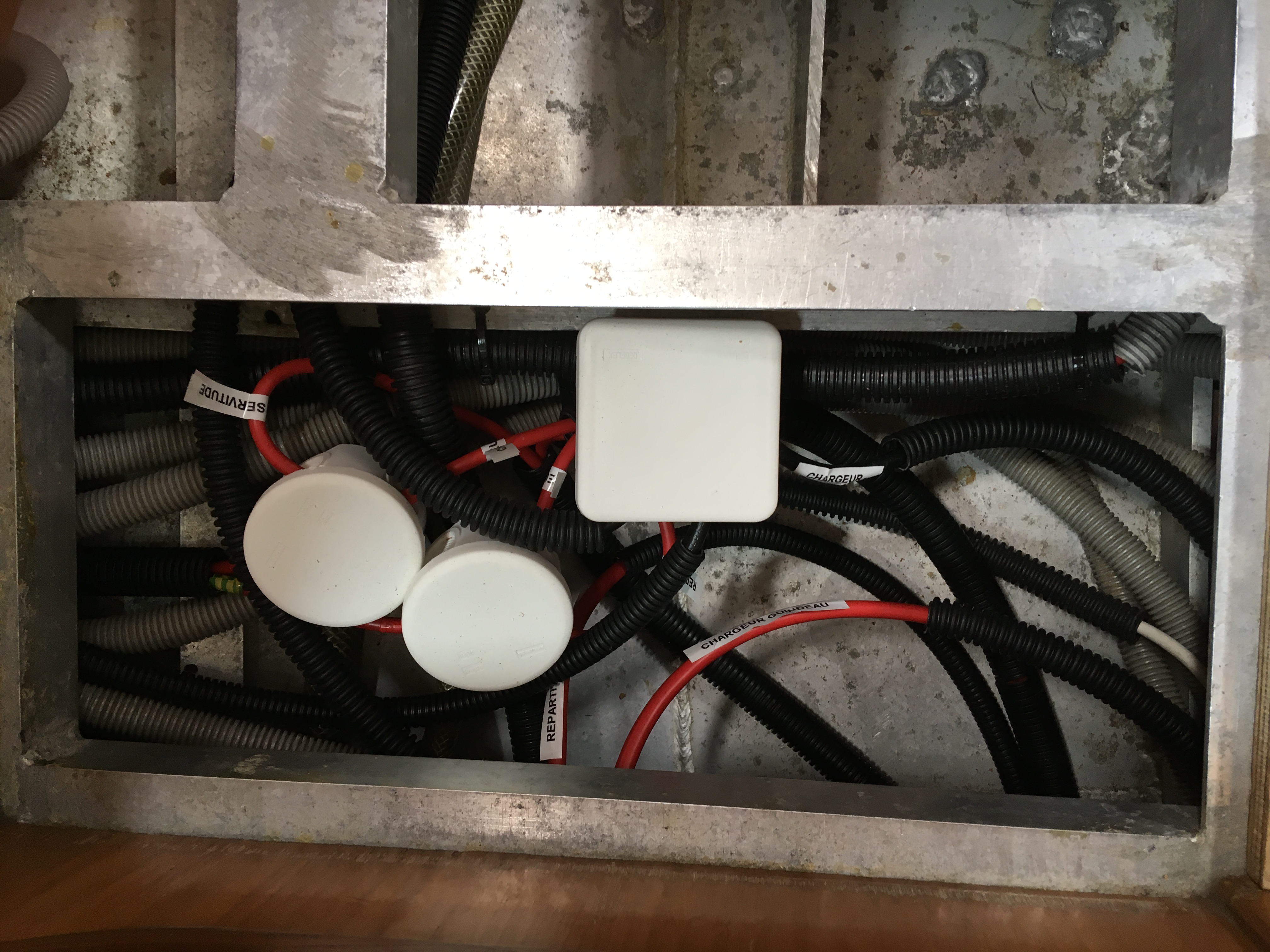 Il a fallut agrandir les percements prévus dans les varangues afin d'y faire passer les câbles de 25 mm2 qui relient répartiteur et chargeur de quai à la batterie guindeau.