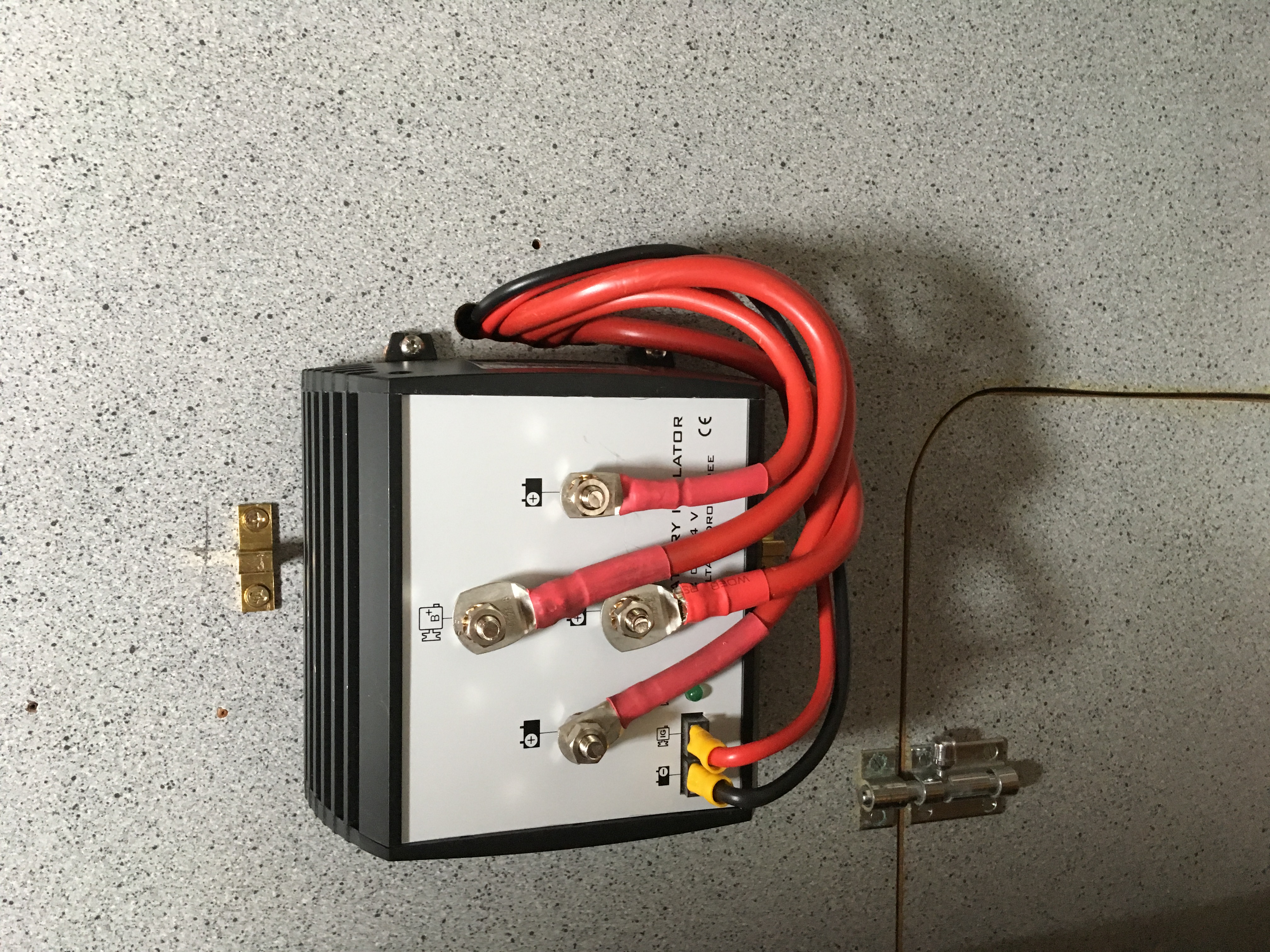 Le meilleur emplacement que j'ai trouvé, de façon à avoir le moins de longueur de câbles, d'être situé au plus près de l'alternateur et d'avoir une bonne aération, est situé sur la cloison du compartiment moteur dans les toilettes.